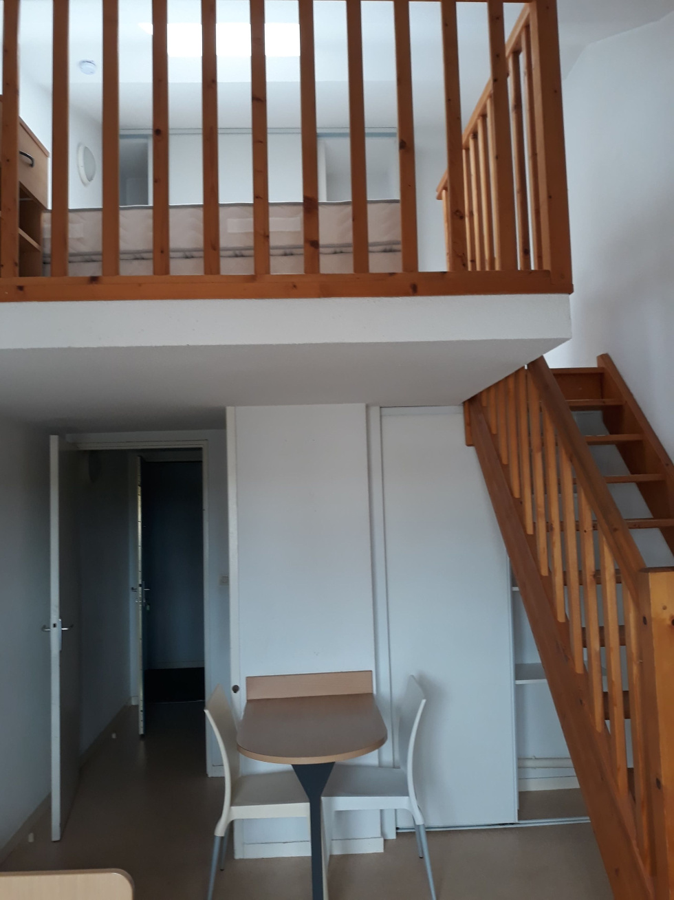 Cet appartement fonctionnel comprend une entrée, une salle d'eau avec WC, une kitchenette, un séjour lumineux et une partie nuit en mezzanine maximisant l'espace et le confort pour le locataire.