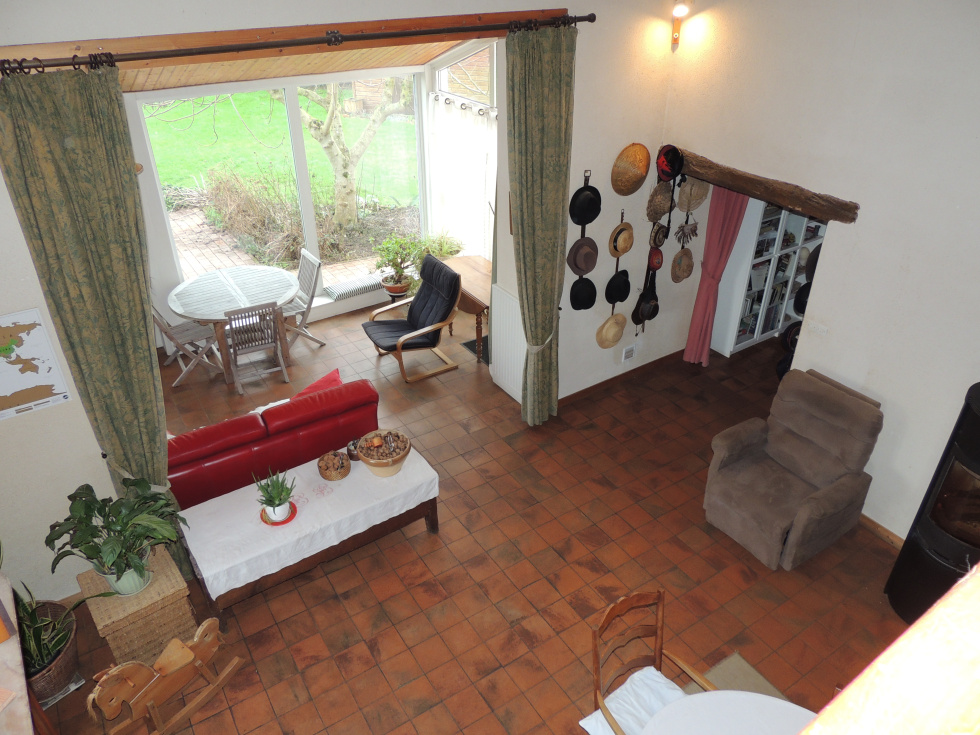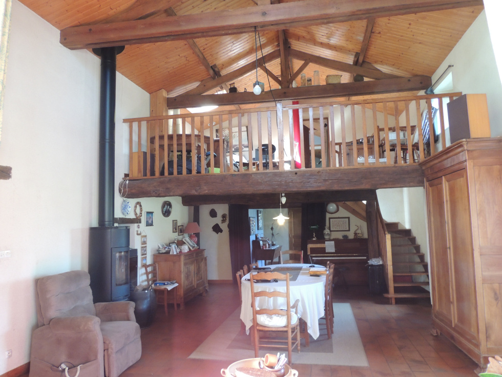 Développant environ 223 m² habitables, la propriété offre dès l’entrée une atmosphère chaleureuse. Vaste espaces de vie avec son poéle a bois, belle hauteur sous plafond et de magnifiques poutres apparentes,